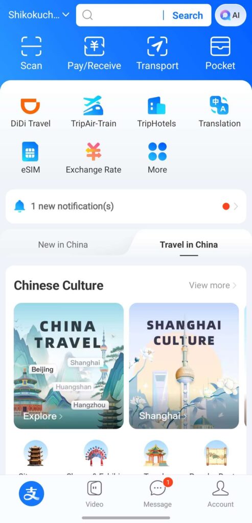- App Store / Google Play で Alipay(支付宝) をダウンロード。